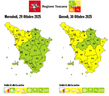 Contemporaneamente è stata emessa anche un'allerta gialla per rischio idraulico del reticolo principale, che domani, dalle 10 alle 23,  interesserà la Lunigiana e i bacini del Bisenzio e Ombrone Pistoiese