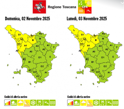 TOSCANA — La sala operativa della protezione civile regionale ha esteso l'allerta meteo con codice giallo per rischio idrogeologico e temporali forti sulla Toscana nord-occidentale.